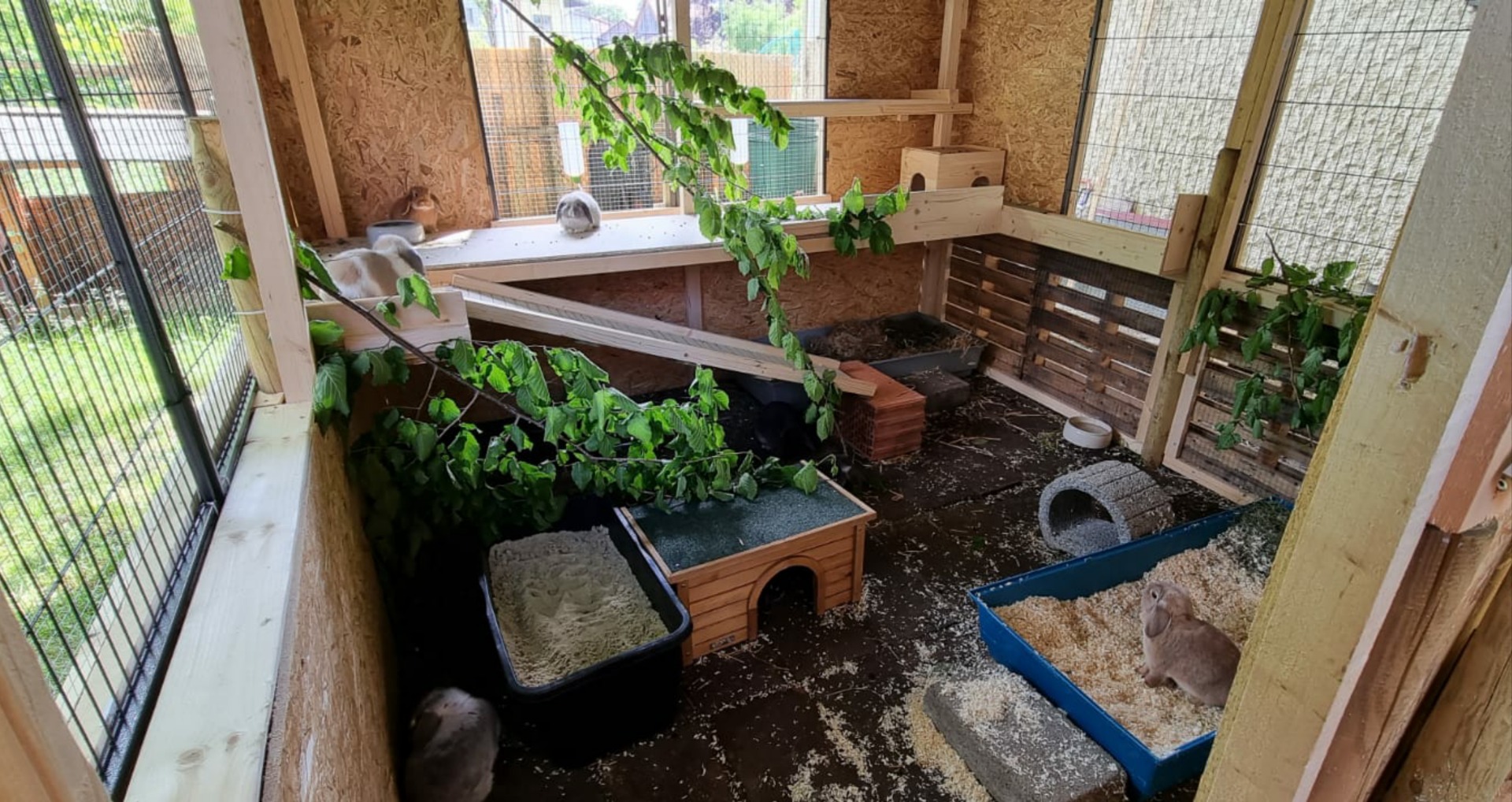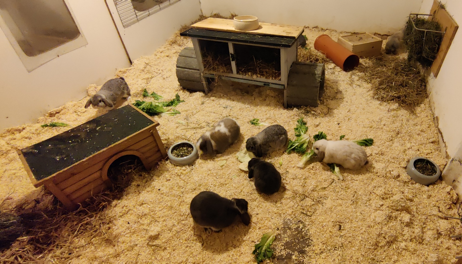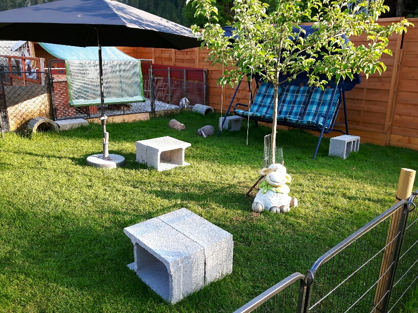 Von Mai bis Oktober genießen meine Zwerge ihren täglichen Freilauf im Grünen. Über den Winter, in der Zuchtpause, leben meine Häsinnen in hellen Kellerräumen in Gruppenhaltung.